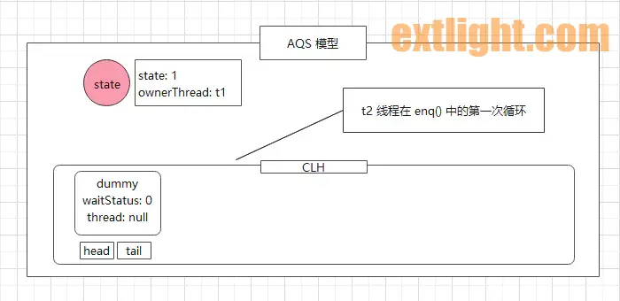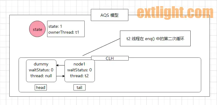 t2 线程进入到 addWaiter 方法中,先被封装到 node1 节点中,由于是首个线程被封装成 Node,因此 tail 和 pred 必定为 null,(9) 处的判断不成立,执行到 (11) 处,即 enq() 方法。该方法中开启无限循环,通过 CAS 方式设置 CLH 队列的头结点/尾节点。
