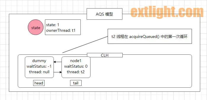 返回的 node1 节点后,t2 线程开始执行 (6) ,node1 节点被当作参数传入到 acquireQueued() 方法中,该方法用于将节点放入到 CLH 队列中,将其线程挂起等待。