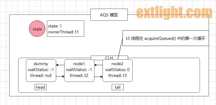 t2 线程将在 acquireQueued() 方法中进行第三次循环操作: