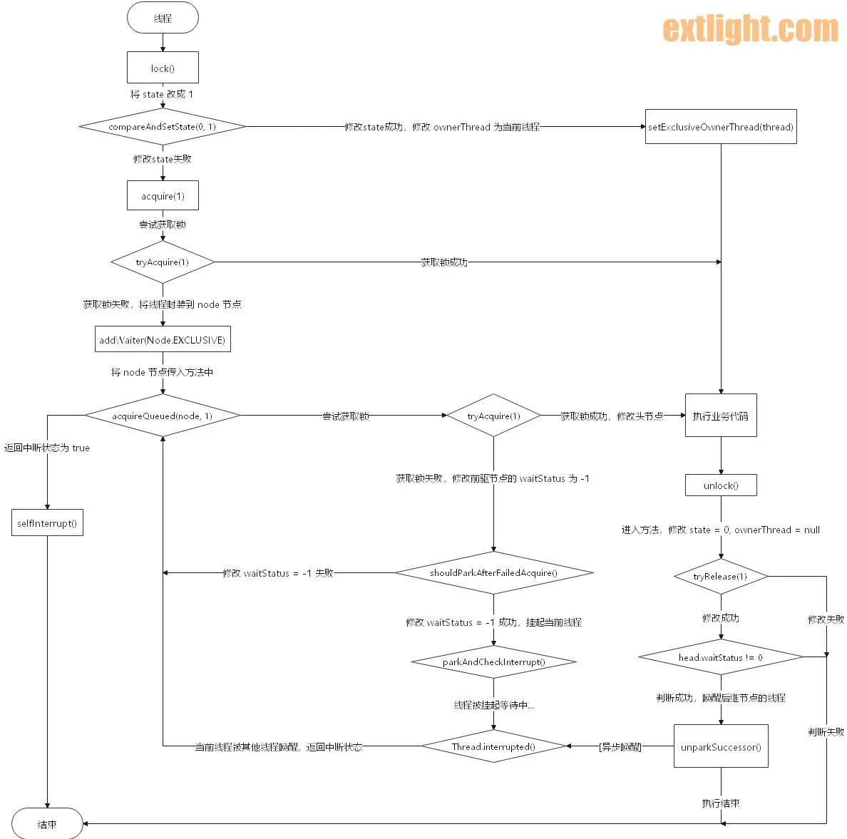 | 1 2 3 4 5 6 7 8 9 10 11 12 13 14 15 16 17 18 19 20 21 22 23 24 25 26 27 28 29 30 31 | public abstract class AbstractQueuedSynchronizer extends AbstractOwnableSynchronizer implements java.io.Serializable { ... final boolean (final Node node, int arg) { boolean failed = true; try { boolean interrupted = false; for (;;) { // 获取前驱节点 final Node p = node.predecessor(); // (14) if (p == head && tryAcquire(arg)) { setHead(node); p.next = null; // help GC failed = false; return interrupted; } // (15): shouldParkAfterFailedAcquire // (16): parkAndCheckInterrupt if (shouldParkAfterFailedAcquire(p, node) && parkAndCheckInterrupt()) interrupted = true; } } finally { if (failed) cancelAcquire(node); } } ... } |