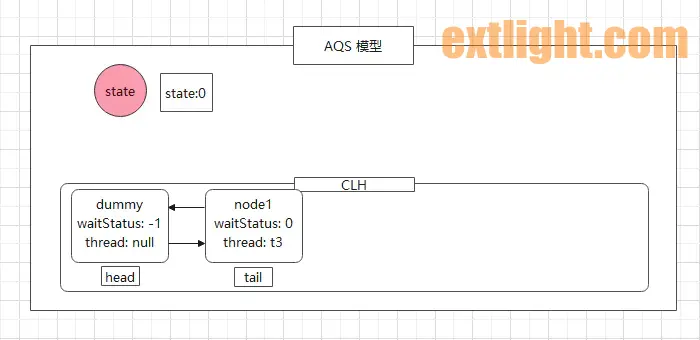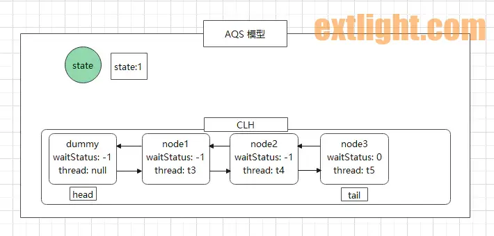 前言说到,Semaphore 是基于 AQS 扩展的,线程竞争资源的状态,线程的等待,线程的唤醒都是靠 AQS 实现和维护的,因此我们通过观察其模型图来讲解其工作原理: