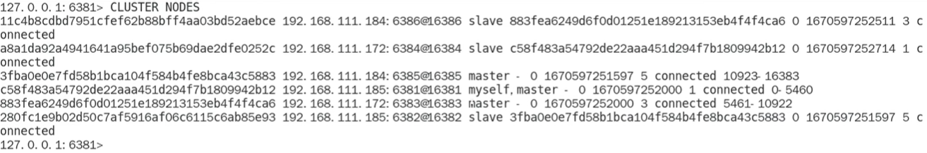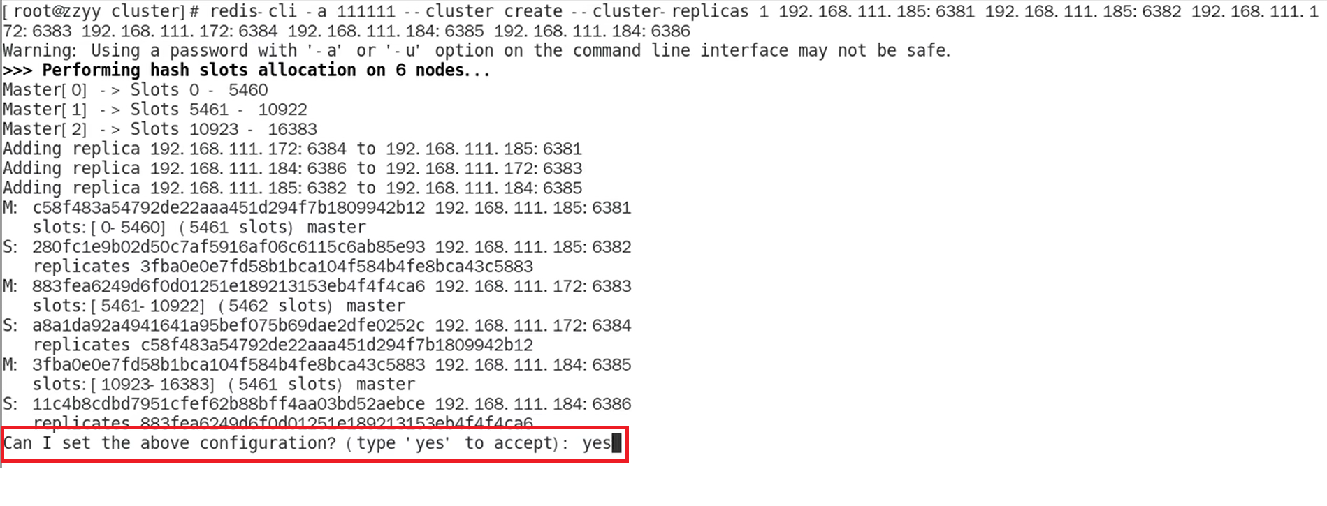 redis-cli --cluster create --cluster-replicas 1 192.168.111.185:6381 192.168.111.185:6382 192.168.111.172:6383 192.168.111.172:6384 192.168.111.184:6385 192.168.111.184:6386