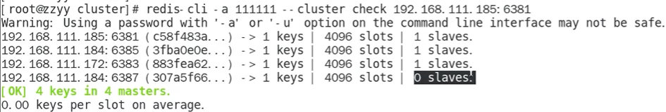 这里我们为了方便将 192.168.111.184:6387 的槽位全部分给 192.168.111.185:6381这时我们使用命令`redis-cli --cluster check 192.168.111.185:6381`检查集群情况可以看到 192.168.111.184:6387 已经变为了 192.168.111.185:6381 的从节点