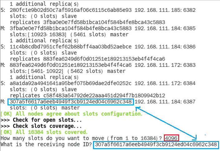 执行命令后,系统会问我们需要移动多少槽位到新节点,这里我们填入 4096。之后需要我们指定新节点的 id,我们填入 192.168.111.184:6387 的节点 id。之后我们根据提示输入 all 即可开始重新分配槽位等待槽位分为完毕后,我们再次检查集群情况可以看到,新节点已经被分配了 4096 个槽位