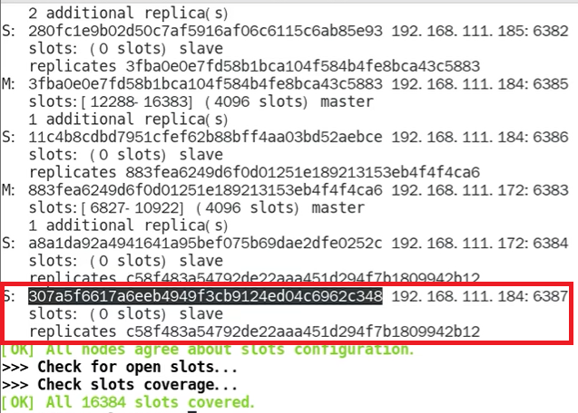 接着,我们查看集群情况可以看到,新节点成功以 slave 身份加入集群并成为 192.168.111.184:6387 的从节点。至此 Redis 分片集群扩容完毕。