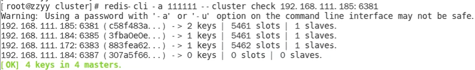 最后我们再次检查集群情况可以看到,集群已经成功从四主四从恢复到了三主三从,只不过 192.168.111.185:6381 的槽位是其他两个主节点的二倍。至此分片集群缩容完毕。