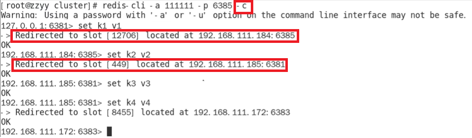 此外,在访问Redis集群时,需要多加一个`-c`参数,否则当存取非该节点的 key 时不会进行重定向可以看到,加入 -c 参数后 Redis 分片集群会将不属于该节点的请求进行重定向。
